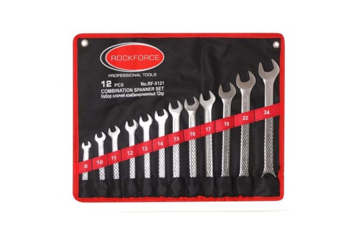 Набор ключей комбинированных 8-24мм 12 предметов на полотне ROCKFORCE RF-5121 позволяет работать с крепежом с различной степенью доступности.