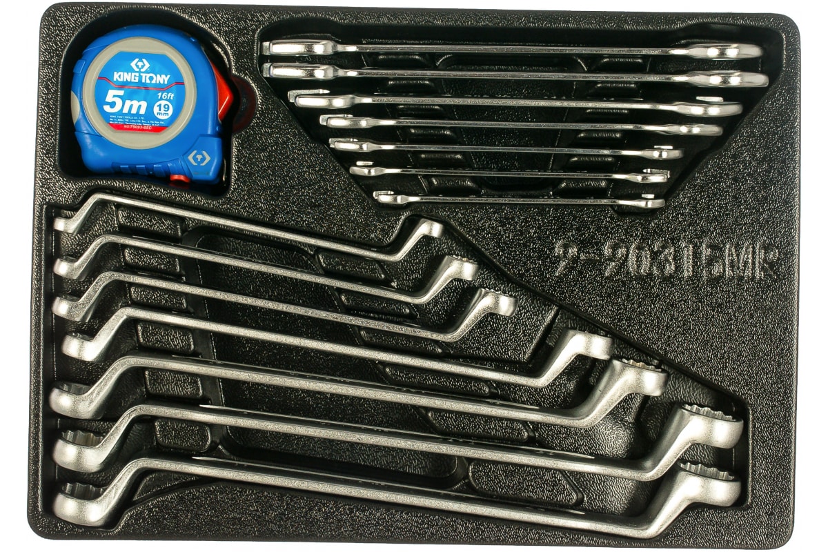 Набор накидных и рожковых ключей, рулетка, ложемент, 15шт KING TONY 9-90315MR состоит из ручных инструментов разнообразных форм и размеров для возможности выполнения широкого спектра крепежных работ. Также в комплекте представлено измерительное приспособление - рулетка с полотном длиной 5 метров и магнитным крюком на конце. Данный набор располагается на ложементе с отдельными ячейками для каждого элемента, за счет чего подходит для комплектации инструментальных тележек.