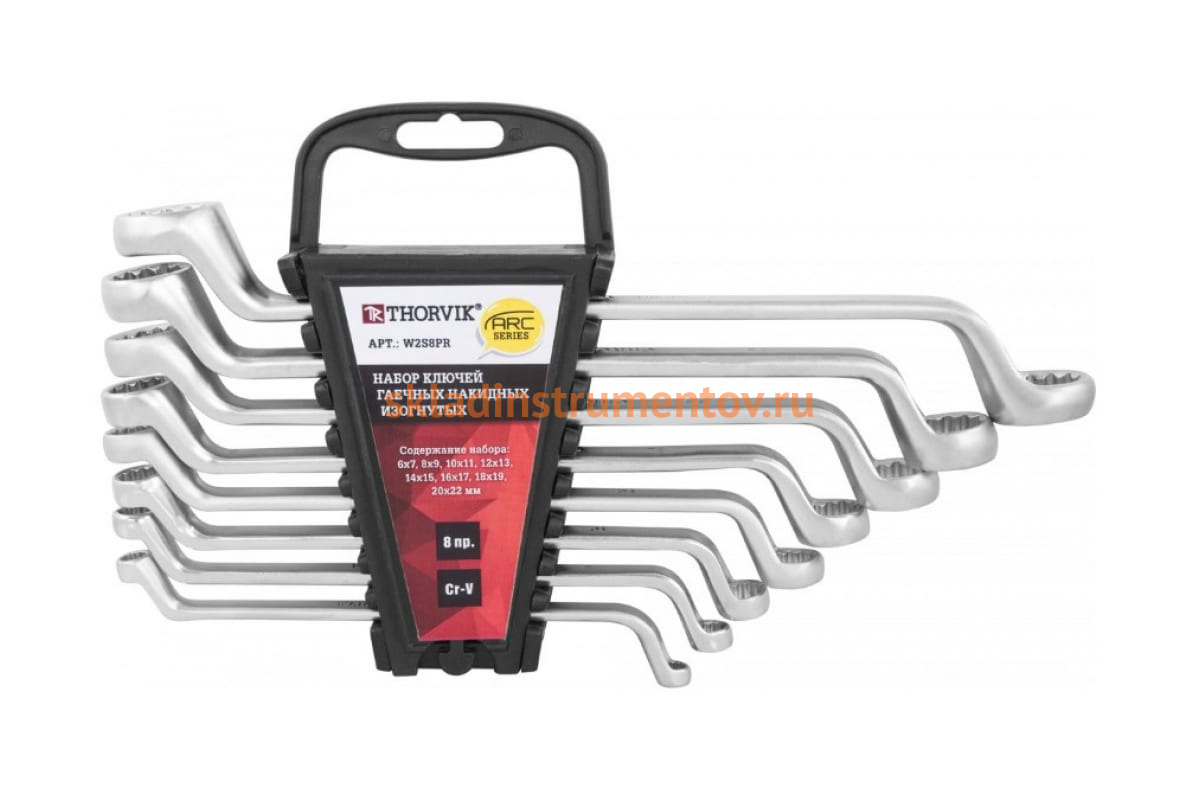 Набор гаечных накидных изогнутых ключей Thorvik W2S8PR серии ARC, 6-22 мм, 8 предметов 52622 используется для ручной затяжки и отвинчивания шестигранного крепежа. Изогнутая конструкция облегчает доступ в труднодоступные места.
