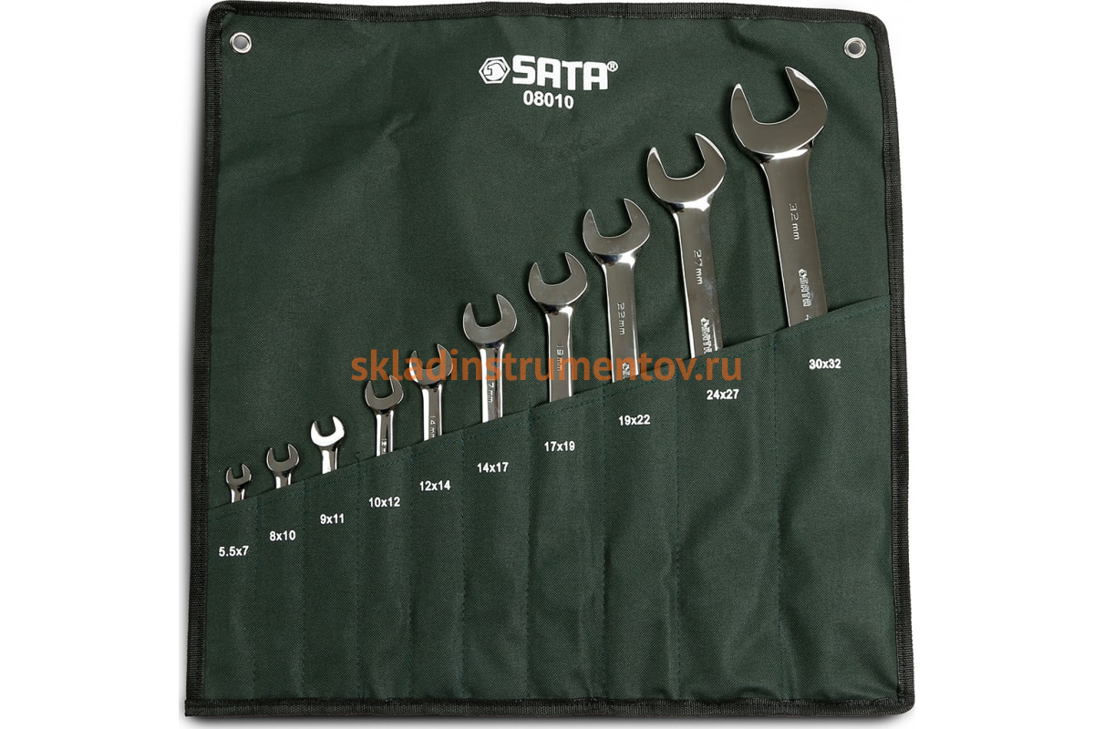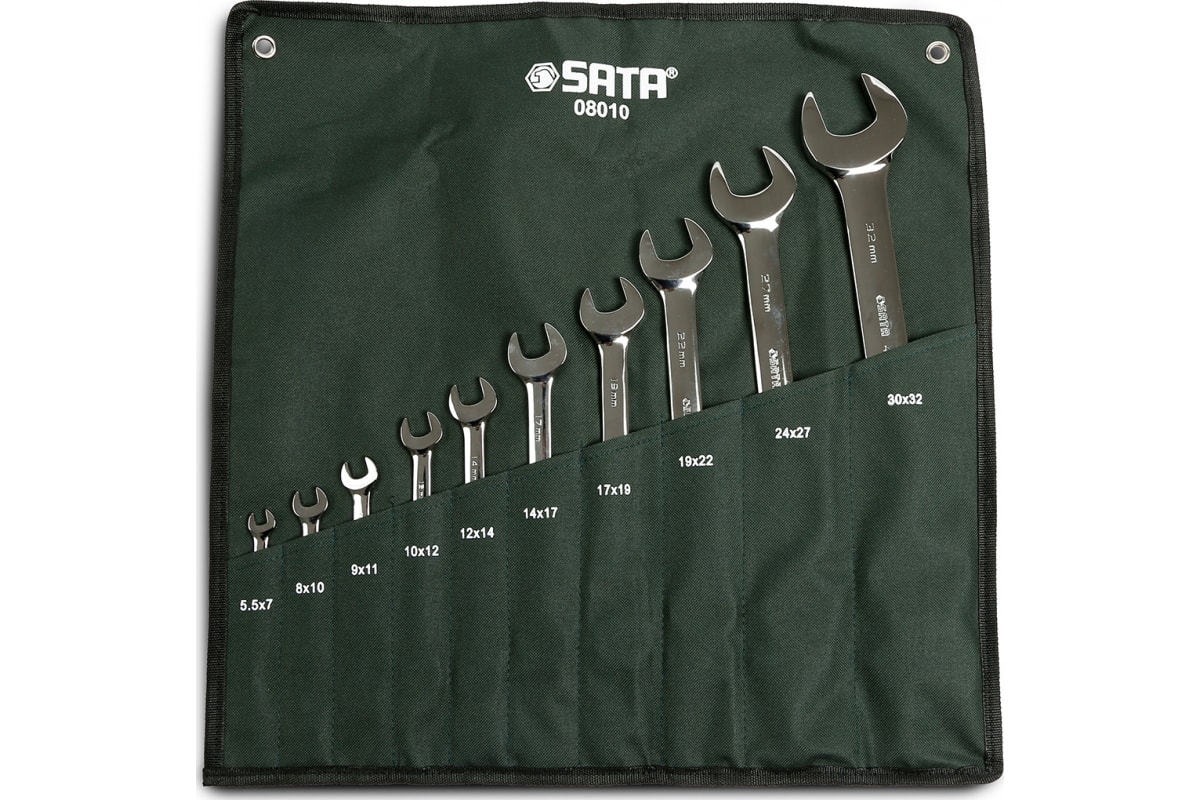 Набор рожковых ключей 10шт Sata 08010 включает в себя ручные инструменты для выполнения крепежных работ с болтами и гайками распространенных размеров. Для удобства хранения и транспортировки комплекта предусмотрен чехол с отдельными карманами для каждого ключа.