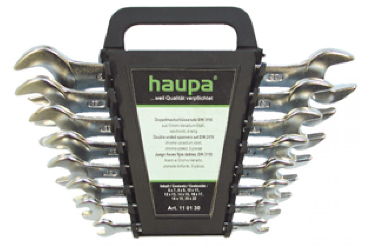 Набор двусторонних гаечных ключей 12 шт. HAUPA 110132 поставляется в специальном держателе, который обеспечивает надежное хранение инструмента и упрощает его транспортировку. Ключи выполнены из хромованадиевой стали, головки отшлифованы.