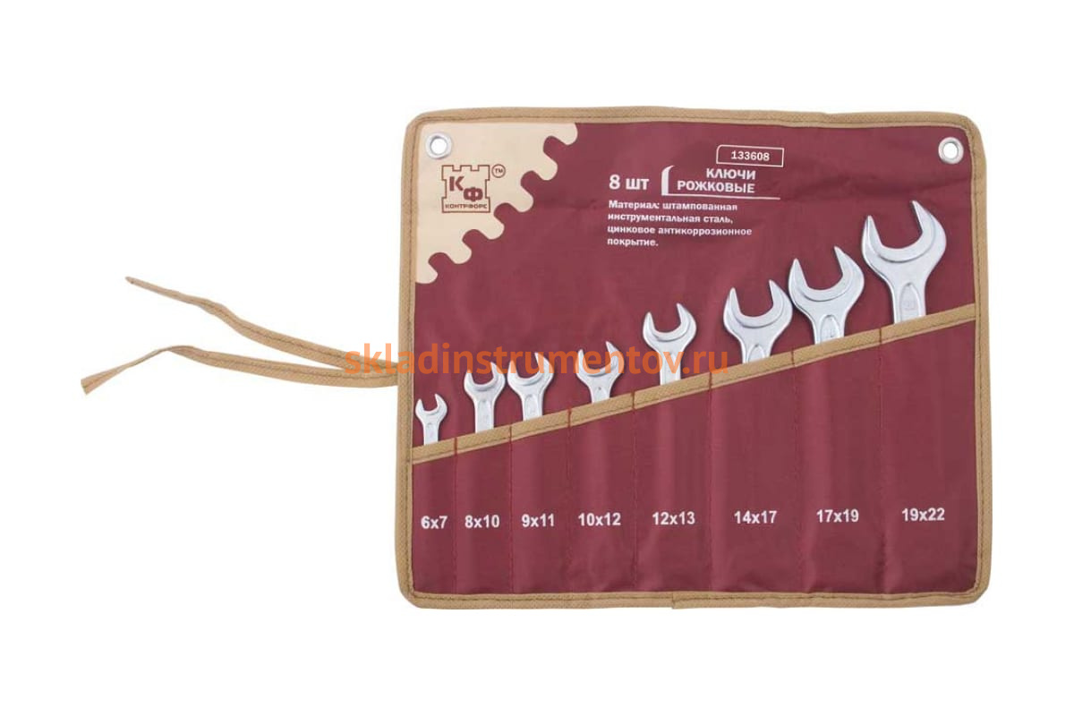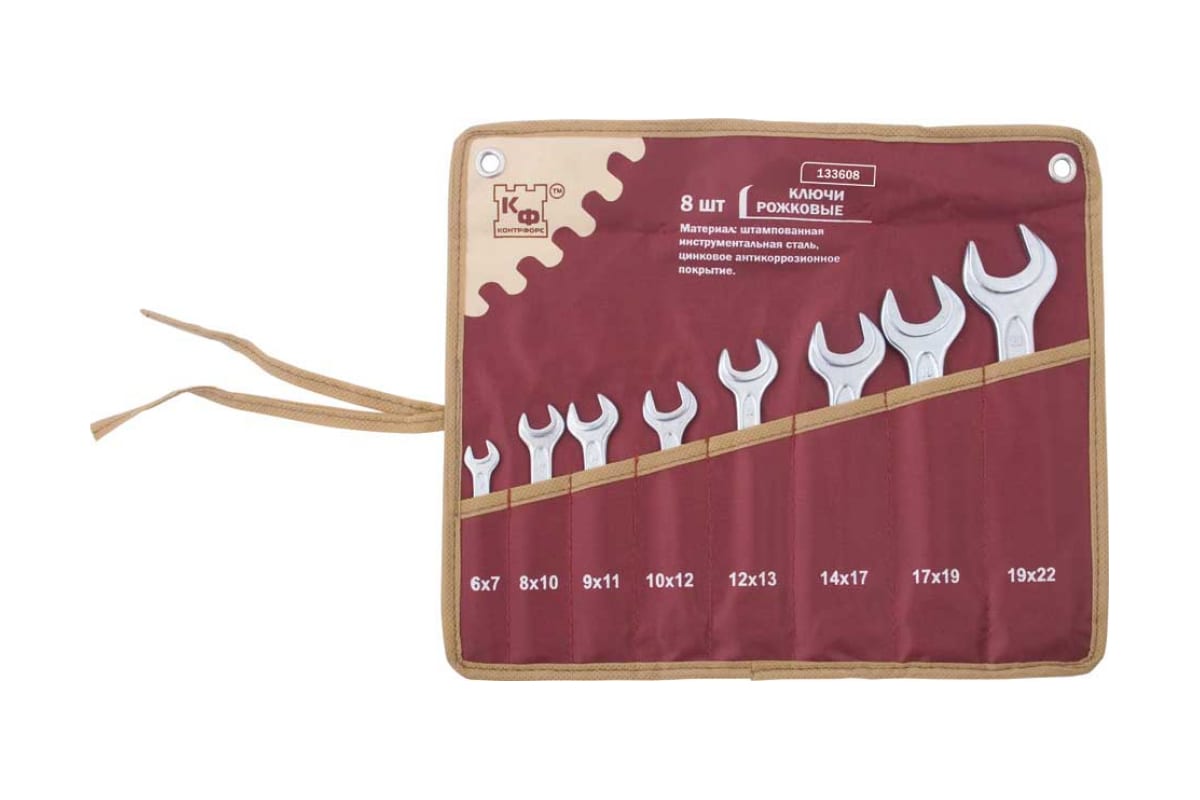 Набор рожковых ключей 8 шт, 6-22 мм Контрфорс 133608 имеет расширенную комплектацию с инструментами распространенных размеров. Такой набор используется для работы в автомобильных мастерских, в производственных цехах и пр. Все компоненты укомплектованы в удобный и практичный нейлоновый чехол, где для каждого ключа есть свой отдельный карман. Инструменты прослужат долгие годы, так как полностью выполнены из прочной стали и имеют антикоррозионное цинковое покрытие.