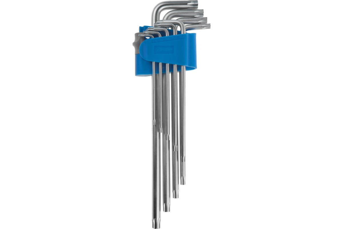 Набор имбусовых ключей, длинные, Cr-Mo сталь, сатинированное покрытие, эргономичный держатель, TORX Т10-Т50, 9шт Зубр ЭКСПЕРТ 27467-H9 - изогнутые ключи с двусторонней конструкцией, где на обоих концах расположены звездообразные рабочие профили торкс.