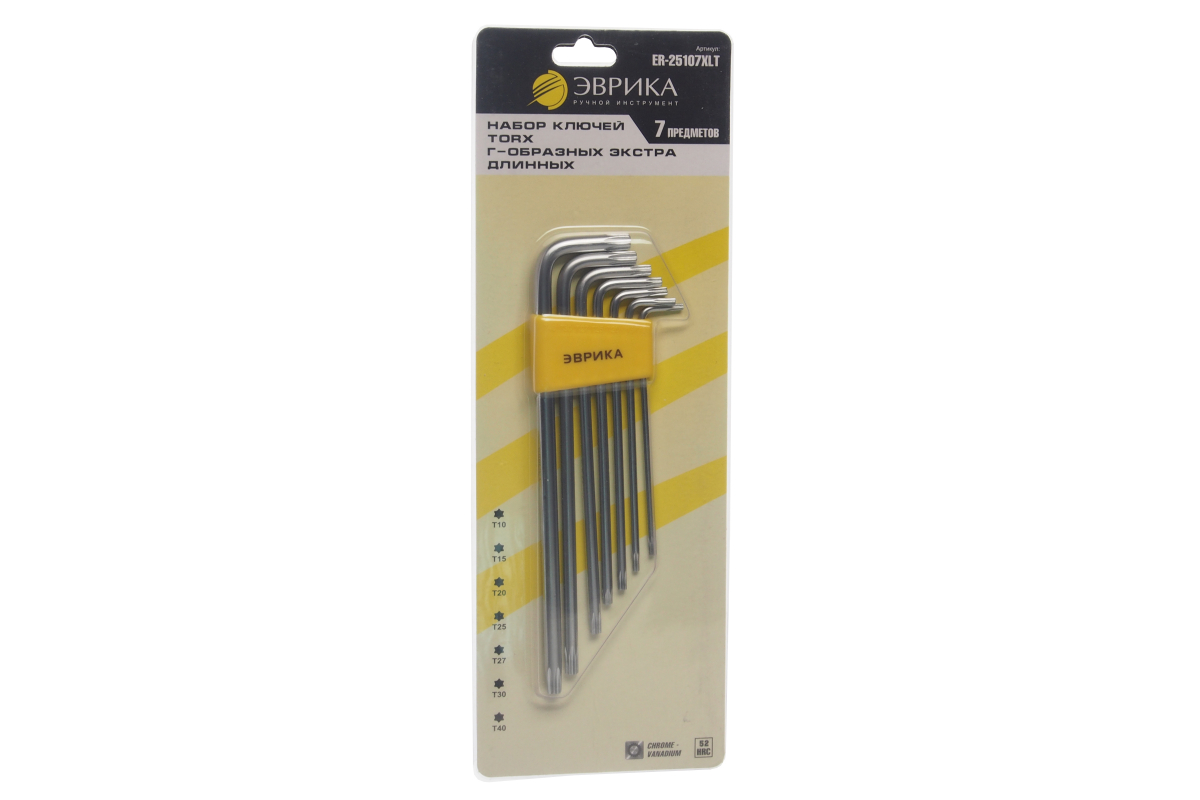 Набор ключей TORX Г-образных экстра длинных T10-T40 7 предметов ЭВРИКА ER-25107XLT позволяет работать с крепежом формата "внутренняя звездочка".