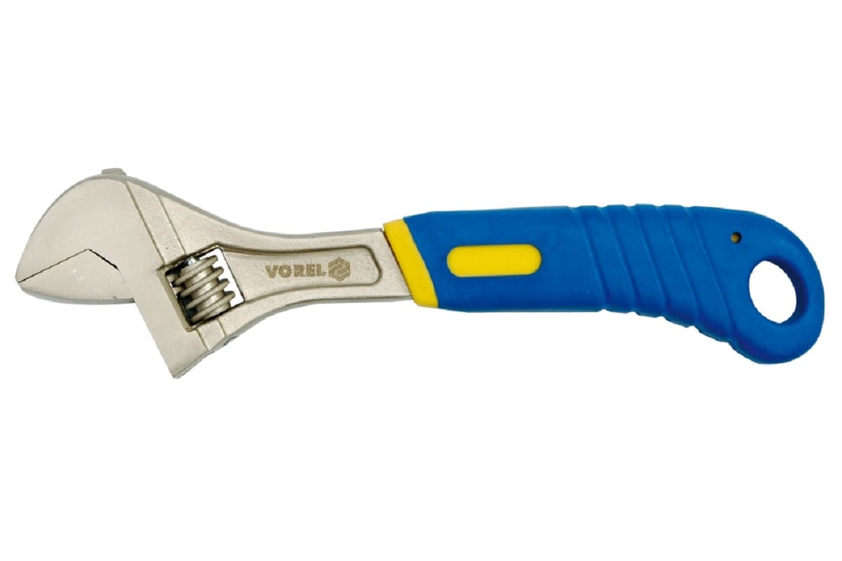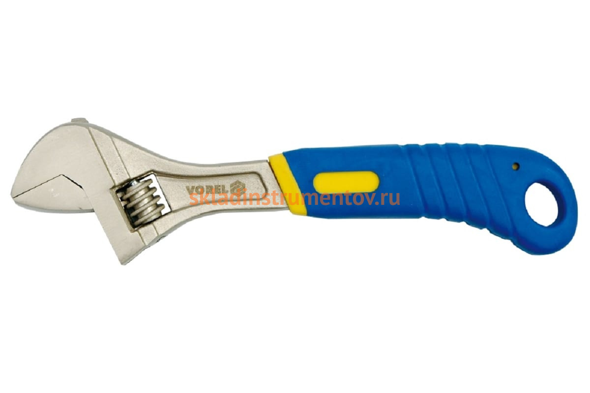 Разводной ключ VOREL резиновая ручка, 250мм 54043 изготовлен из углеродистой стали. Поверхность ключа никелированная. Ручка в резиновой оболочке.
