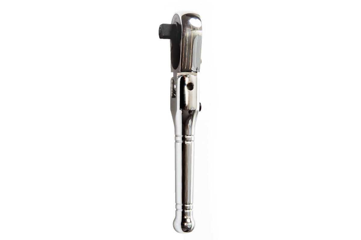 Шарнирная трещотка 3/8" Hans 3144PQ имеет флажковый переключатель реверсивного механизма, а также кнопку для быстрого снятия торцевой головки или удлинителя. Инструмент полностью выполнен из прочной стали. Зона обхвата ладонью обладает эргономичной формой для комфортного использования.