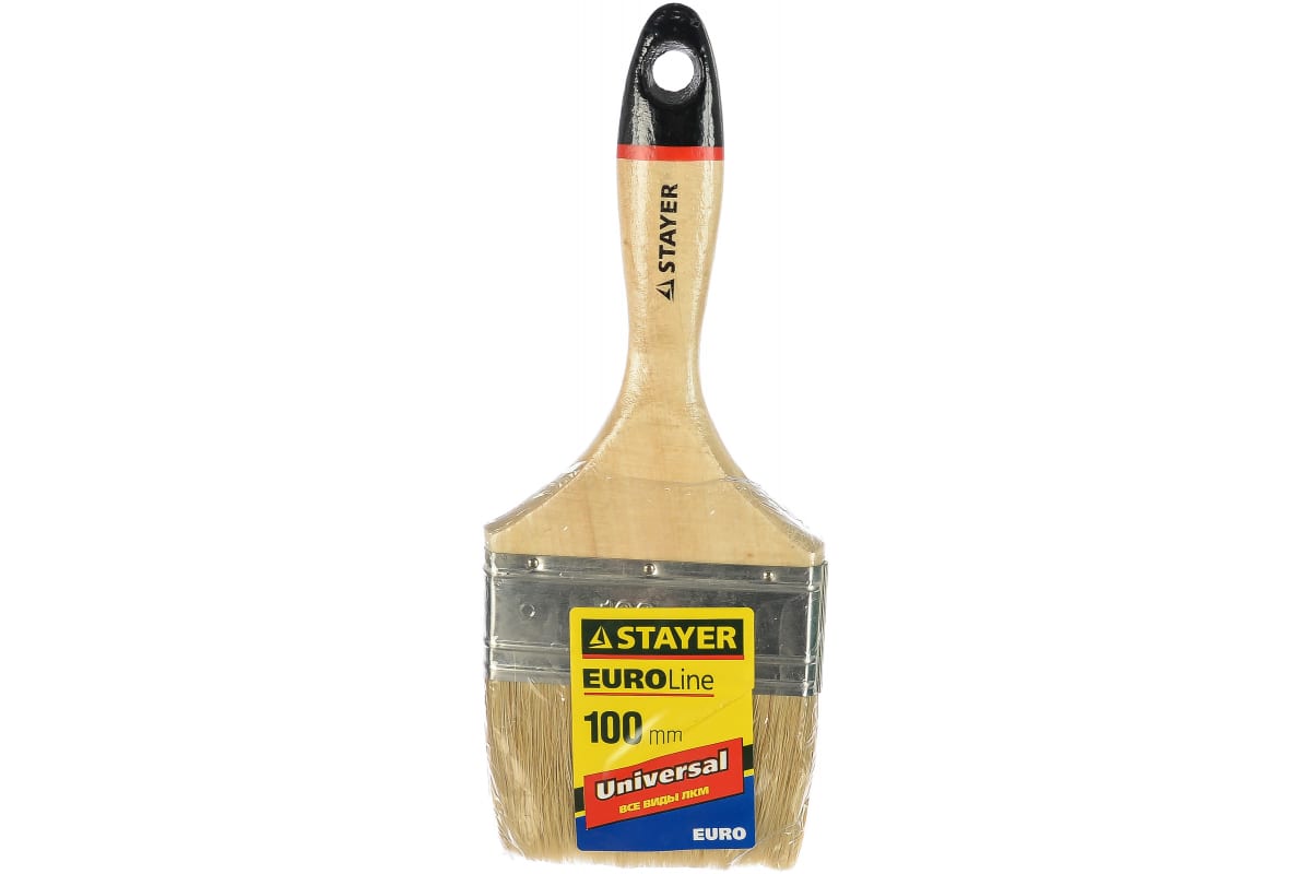 Плоская кисть STAYER UNIVERSAL-EURO 0102-100 используется для работ с масляной краской, олифой, древесным маслом и другими ЛКМ. Размер кисти составляет 100 мм. Металлический бандаж надежно фиксирует щетину, что предотвращает ее выпадение. Кисть имеет повышенное впитывание за счет расщепленных кончиков натуральной щетины. Рукоятка покрыта лаком и изготовлена из древесины твердых пород, что увеличивает срок эксплуатации.