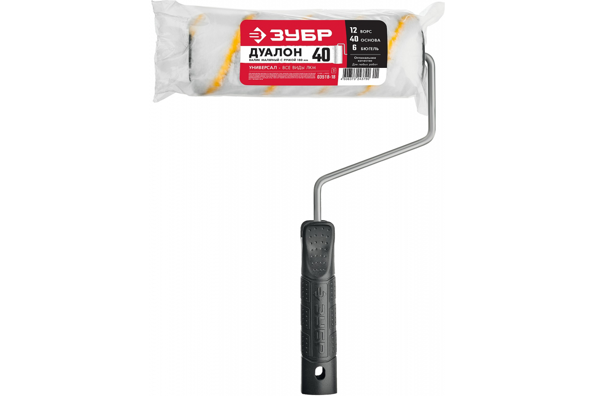 Малярный валик Зубр ДУАЛОН 40, 180 мм, d=40 мм, ворс 12 мм, ручка d=6 мм, 03518-18_z01 представляет собой универсальную модель для работ со всеми видами ЛКМ. Оптимально применение данной модели на ровных поверхностях с красками на масляной основе.