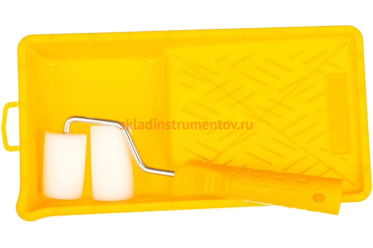 Валик STAYER ПОРОЛОН МИНИ в наборе с ванночкой 0544-05-07 - комплект из валика, ролика и ванночки, применяемый для окрашивания поверхностей различными видами красок, эмалей и грунтовок. Шубки выполнены из полиуретана и имеют ширину 50 мм и 70 мм. Не рекомендуется использовать с материалами на основе ацетона.