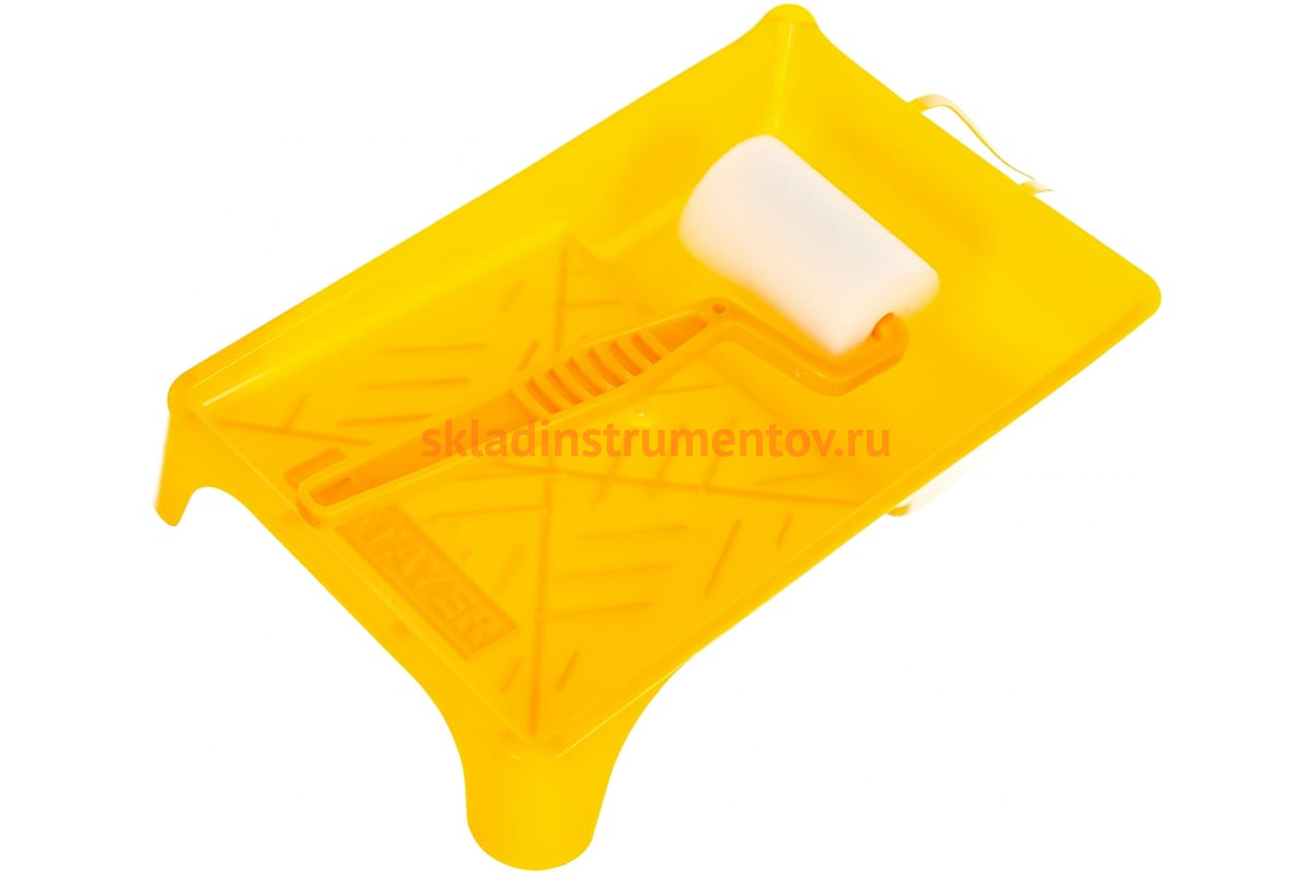 Валик STAYER ПОРОЛОН МИНИ в наборе с ванночкой 0544-05 - инструмент размером 50 мм для обработки труднодоступных поверхностей различными красками, эмалями и грунтовками. Шубка выполнена из вспененного полиуретана. В комплекте предусмотрена ванночка для равномерного распределения краски по поверхности валика. Не рекомендуется использовать с материалами на основе ацетона.