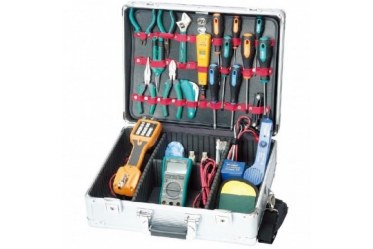 Набор инструментов ProsKit PK-14019B 00271611 включает в себя обширный ассортимент различного губцевого инструмента, отверток, электромонтажных приспособлений.