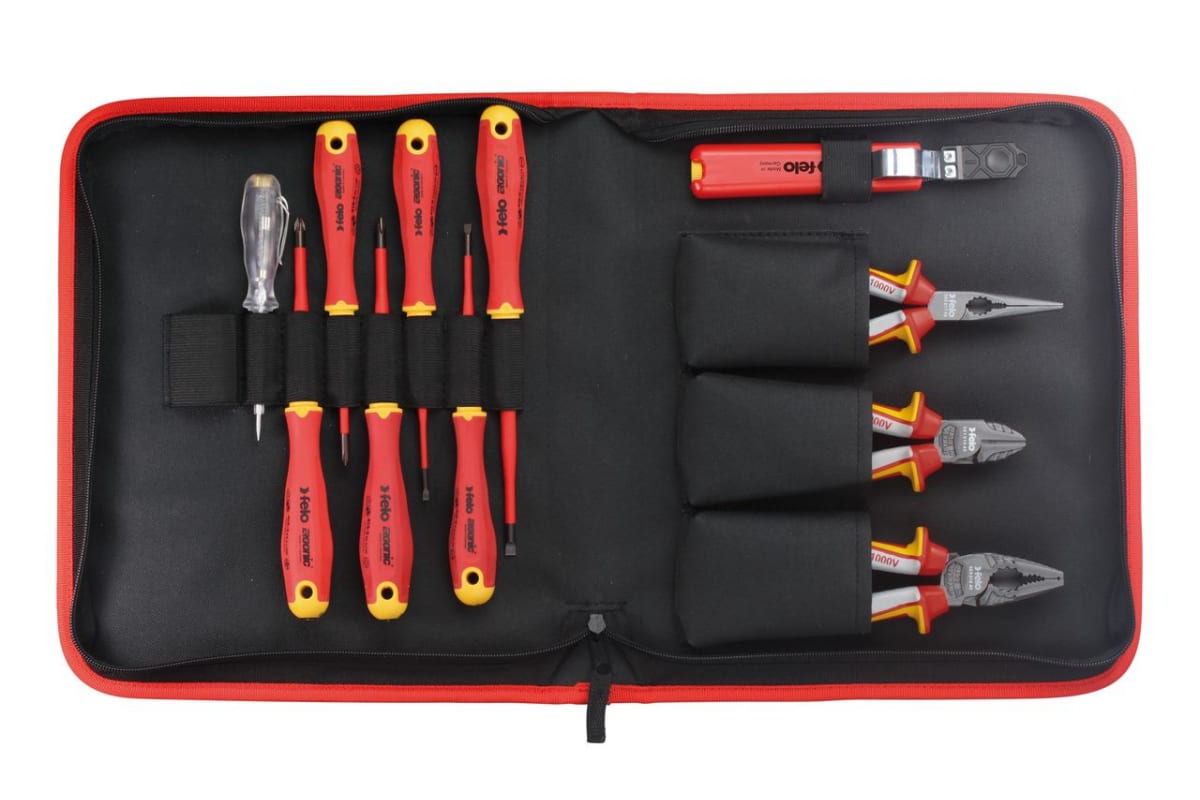 Набор диэлектрических отверток SL/PH/PZ E-Slim, бокорезов, плоскогубцев, длинногубцев, стриппера и отвертки тестера напряжения сети в сумке Felo ERGONIC 41381104 представлен в оптимальной комплектации. Включает в себя самый необходимый инструмент для проведения электромонтажных работ под напряжением до 1000 В.