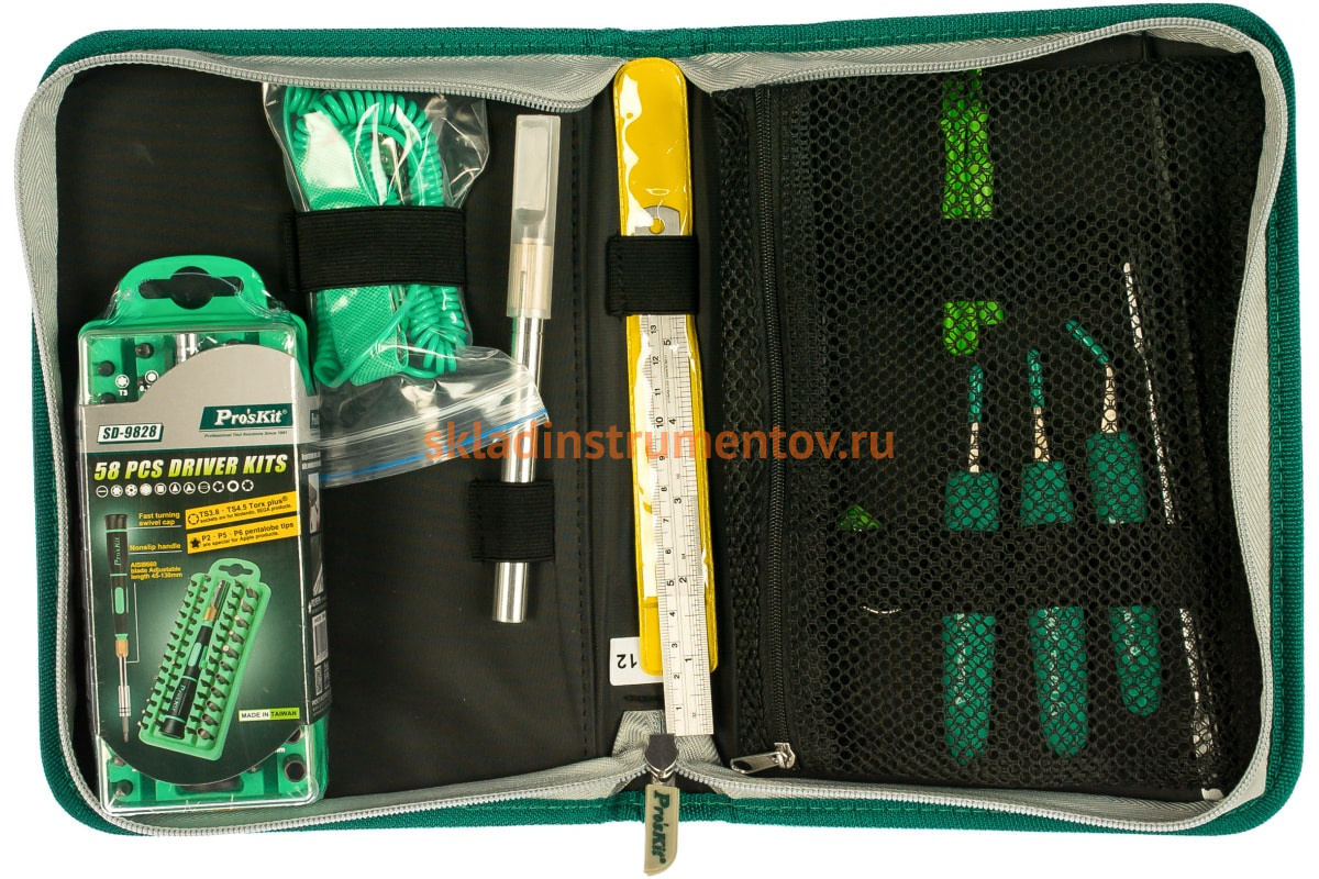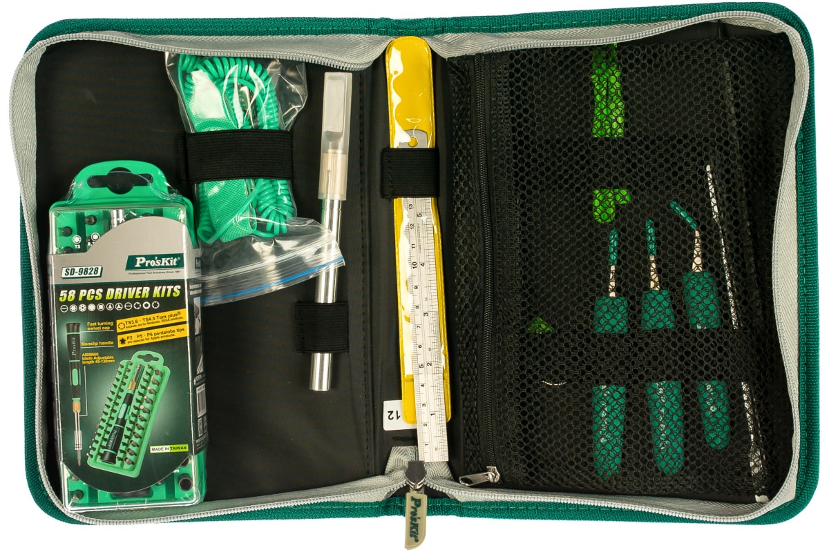 Набор инструмента ProsKit PK-9112 00322519 включает принадлежности, которые необходимы при ремонте смартфонов, ноутбуков, игровых приставок.