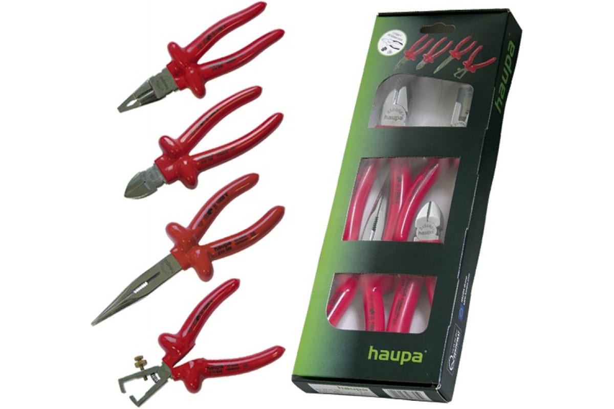 Набор клещей VDE 4шт HAUPA 220126 - комплект изолированных ручных инструментов для проведения ремонтно-монтажных работ под высоким напряжением. В наборе представлены пассатижи, длинногубцы, диагональные кусачки и клещи для снятия изоляции с проводов. Рабочие части инструментов изготовлены из стали С45, закалены в масле и хромированы. Рукоятки имеют двухцветную изоляцию (внутри желтую, снаружи красную), которая выполняется методом погружения.