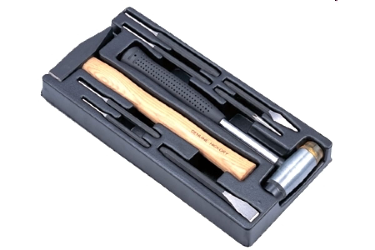 Набор молотки и выколотки Hans TT-13 подойдет для проведения различных работ по дереву, например, выдалбливанию отверстий или фигурной резке. В комплект входит два молотка: обычный столярный и молоток со сменным бойком. Рабочие части инструментов изготовлены из прочных и долговечных материалов. Набор оснащен ложементом, на котором удобно размещать изделия, хранить и транспортировать.