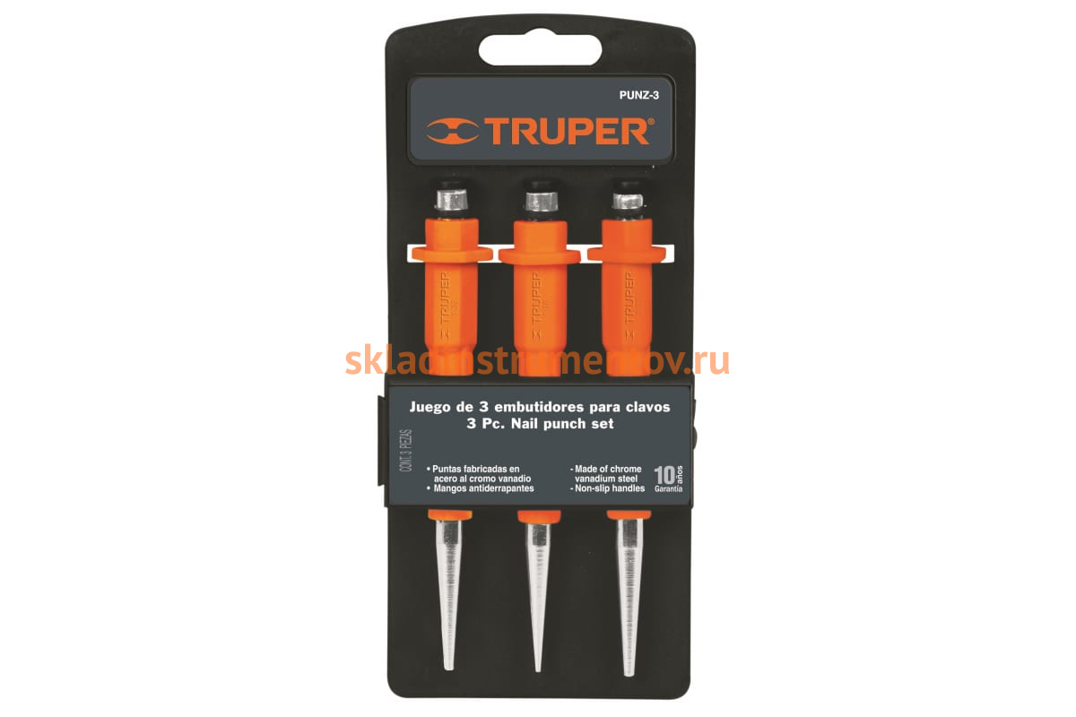 Набор кернов 3 шт Truper PUNZ-3 18064 служит для пробивания отверстий в заготовках или вырезания пазов. Рабочая часть инструментов выполнена из хромванадиевой части, которая обладает износостойкостью и прочностью. Удобные рукоятки на конце оснащены протекторами, по которым наносятся удары.