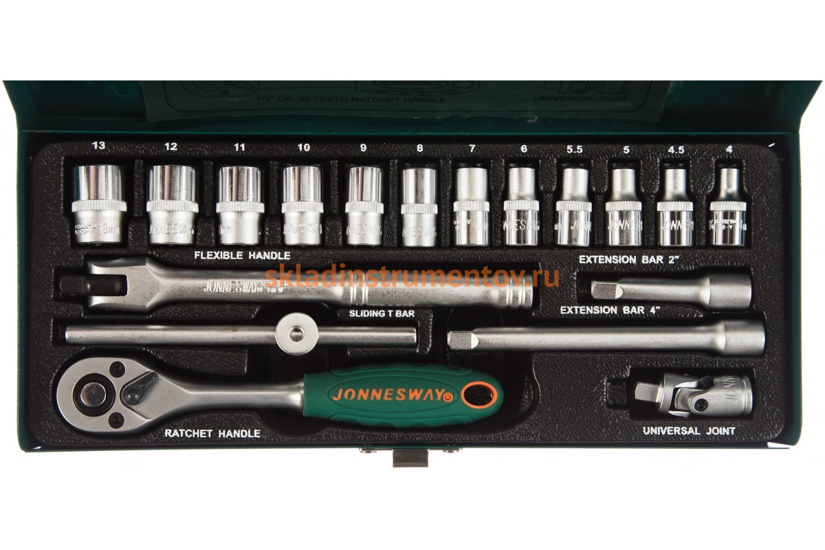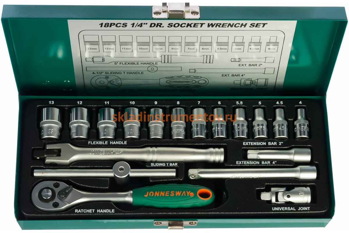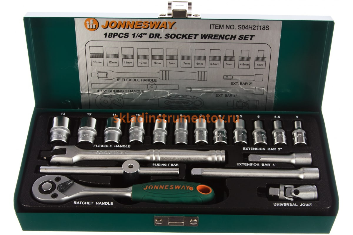 Набор торцевых головок 18 предметов Jonnesway S04H2118S состоит из: трещотки, воротка шарнирного, воротка Т-образного, двух удлинителей, двенадцати торцевых головок и карданного шарнира. Применяется при слесарно-монтажных работах, при ремонте автомобиля. Все инструменты высокого качества и отличаются долгим сроком службы.