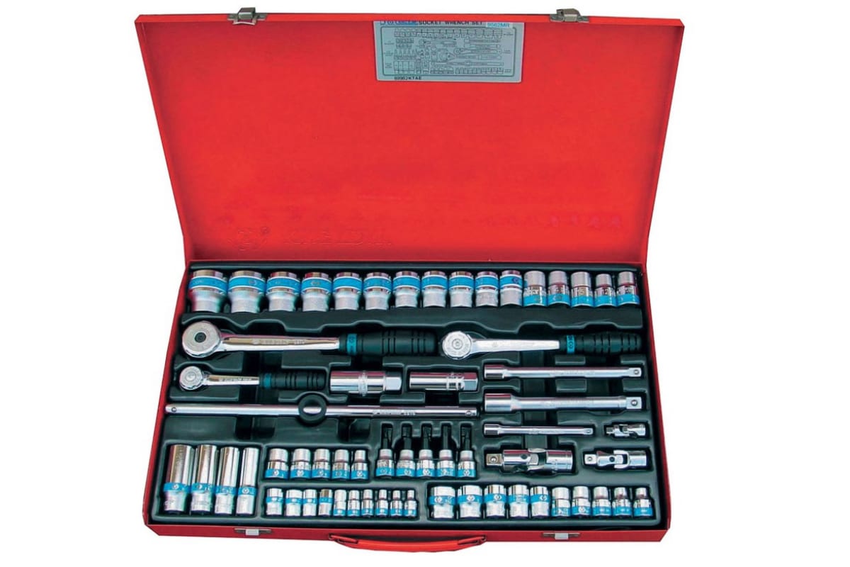 Набор торцевых головок с принадлежностями (1/4"&3/8"&1/2", шестигранные, 4-32 мм, 62 предмета) KING TONY 9564MR включает в себя большое количество оснастки и ручного инструмента для удобства монтажа и демонтажа резьбовых креплений. Посадочный размер головок составляет 1/4, 1/2 и 3/8 дюйма. Вес комплекта - 7.5 кг.