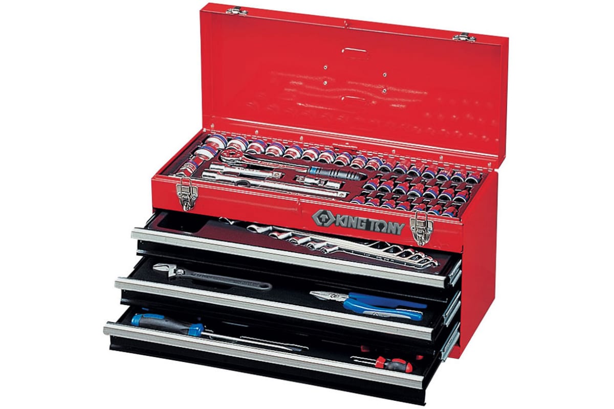 Универсальный набор инструментов 69 предметов KING TONY 901-069MR01 предназначен для работы с крепежом как мелких, так и средних размеров. Данный комплект отлично подойдет для использования в столярно-слесарных мастерских, на станциях ТО и в других местах с большим потоком заказов (обслуживание автомобилей, ремонт техники и т. п.). Поставляется в эргономичном ящике, оснащенном тремя выдвижными полками и одним отсеком под ложементы.
