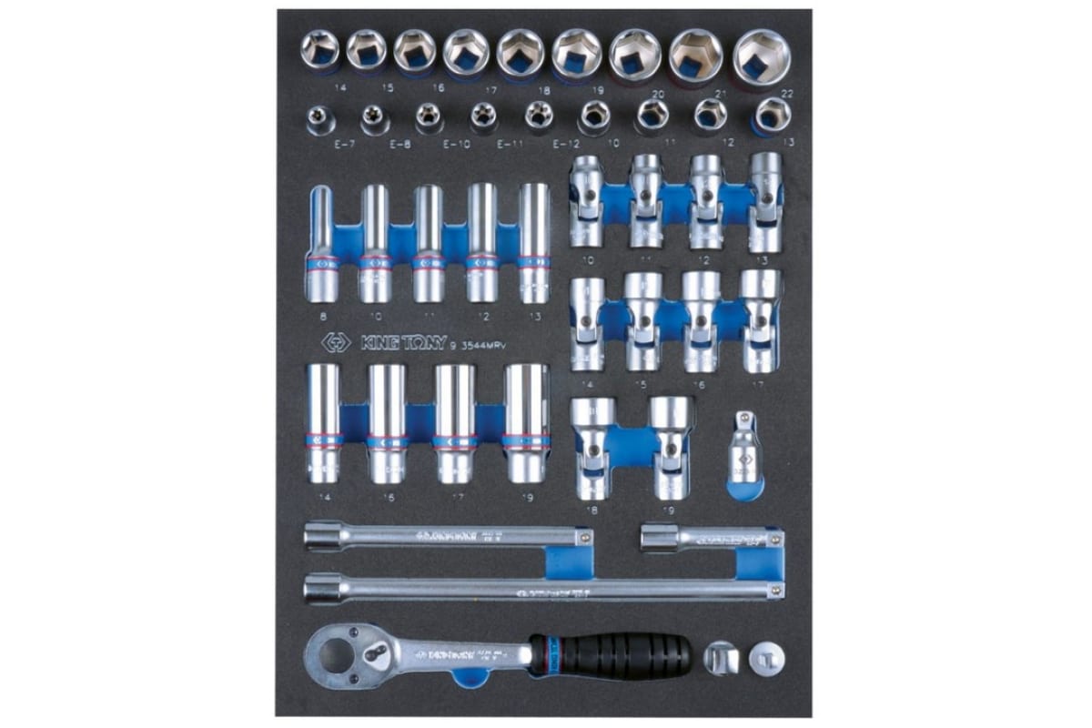 Набор торцевых головок с принадлежностями (3/8", ложемент, 44 предмета) KING TONY 9-3544MRV представляет собой упорядоченный комплект ручного инструмента и оснастки, назначением которых является монтаж и демонтаж резьбового крепежа. Удлинители делают возможной работу с элементами в углублениях. Ложемент набора изготавливается из устойчивого к деформации материала ЭВА (дополнительные характеристики - легкость, прочность, маслостойкость).