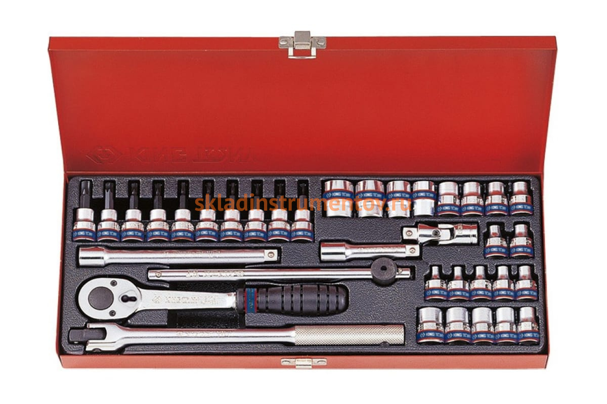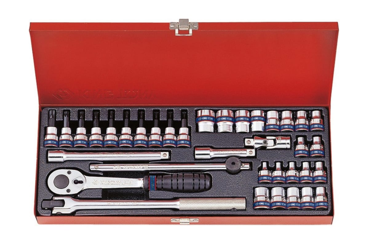 Набор шестигранных торцевых головок с принадлежностями 3/8", 6-19мм 36шт KING TONY 3534MR включает в себя трещотку, необходимые приспособления и широкий ассортимент головок. Скользящий вороток, шарнирный удлинитель и переходник существенно упрощают процесс выполнения крепежных работ в труднодоступных местах. Трещоточный ключ удобен в использовании, он имеет реверсивный переключатель и эргономичную накладку на ручке.