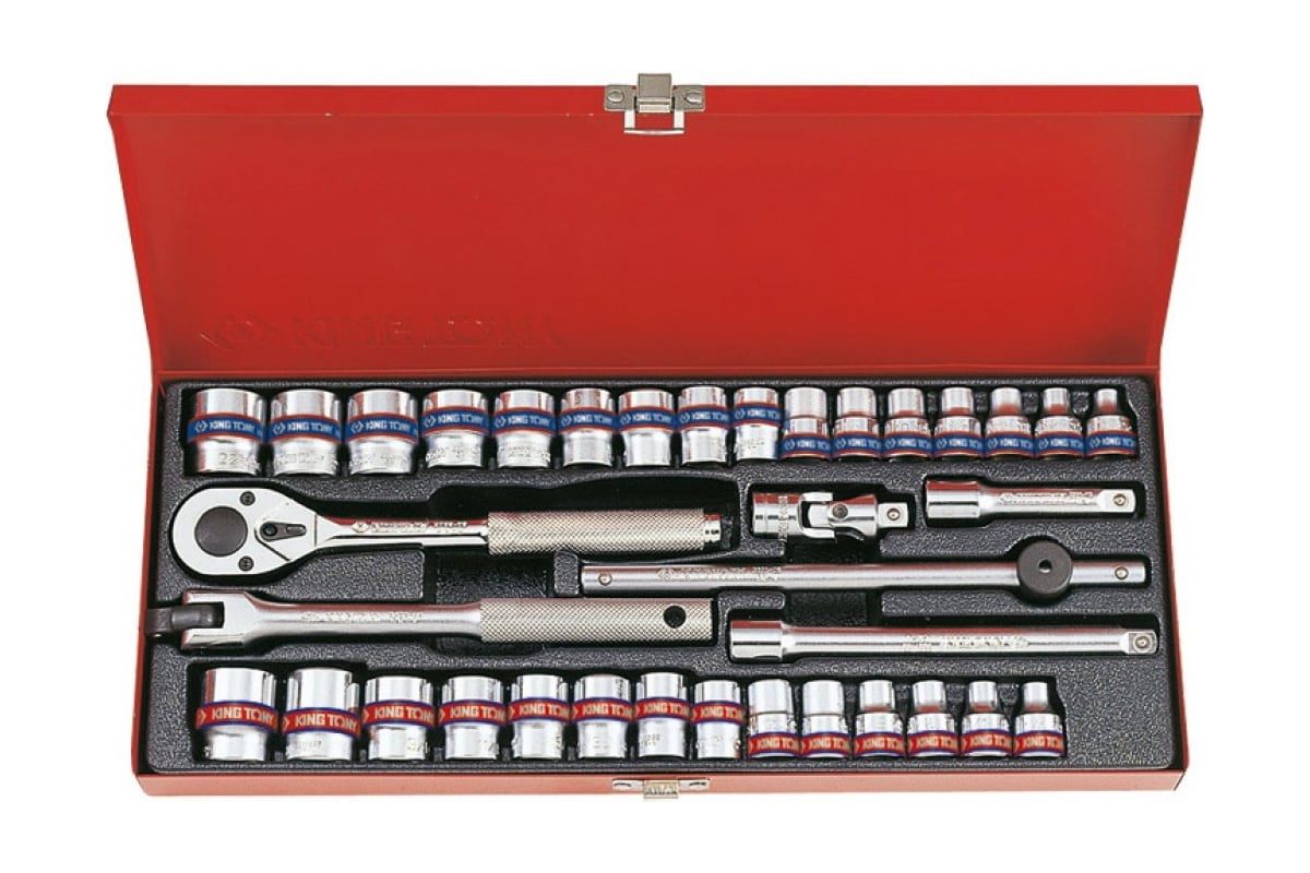 Набор двенадцатигранных торцевых головок с принадлежностями 3/8", 6-22мм, 1/4"-13/16", 36шт KING TONY 3036CR - достаточно большой комплект для выполнения ремонтных, сборочных и демонтажных работ при обслуживании автомобилей и другой техники. Набор удобно хранить и легко транспортировать благодаря закрывающемуся металлическому футляру с отдельными ячейками для каждого компонента.