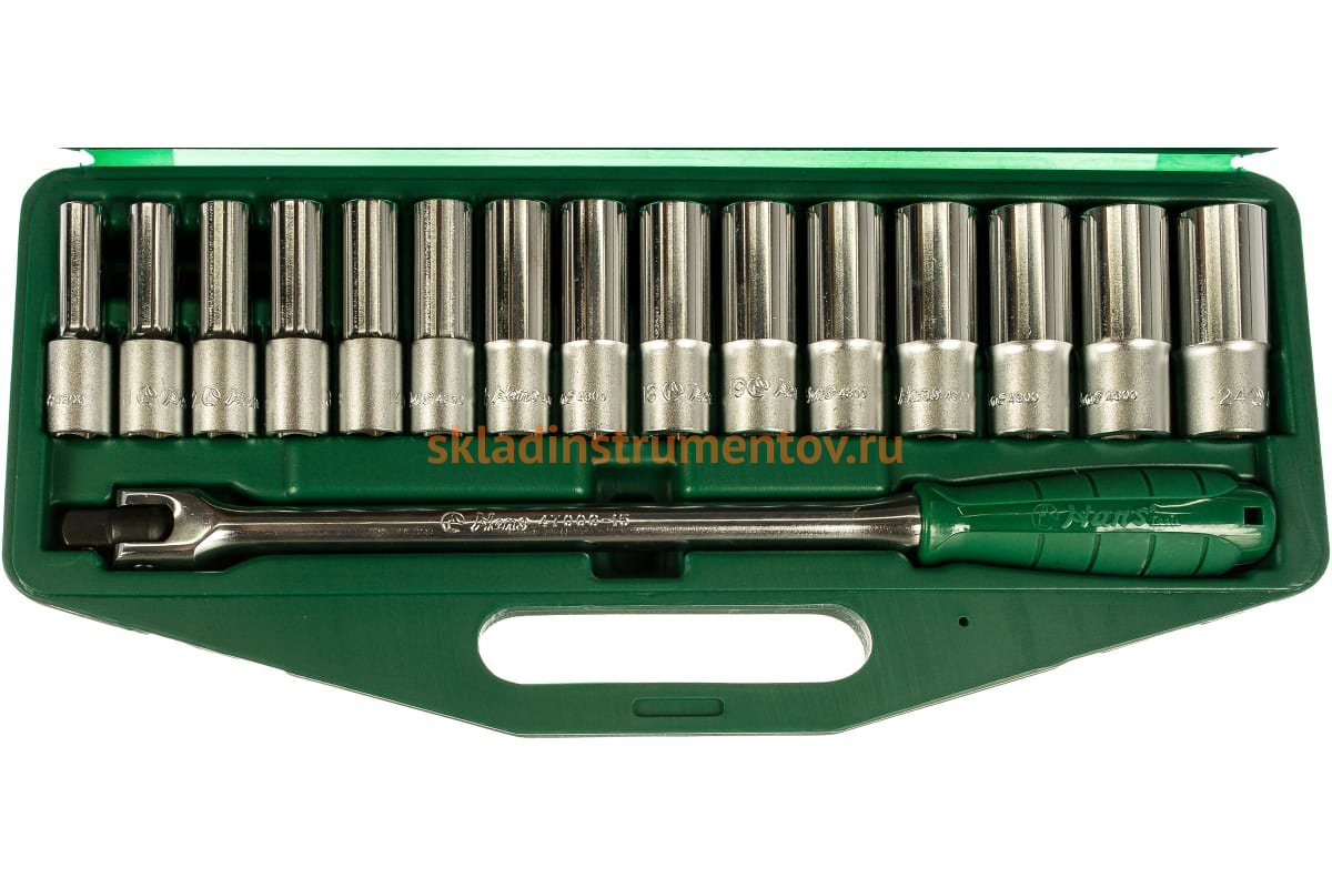 - 12 торцевых головок: 10, 11, 12, 13, 14, 15, 16, 17, 18, 19, 20, 21, 22, 23, 24 мм.