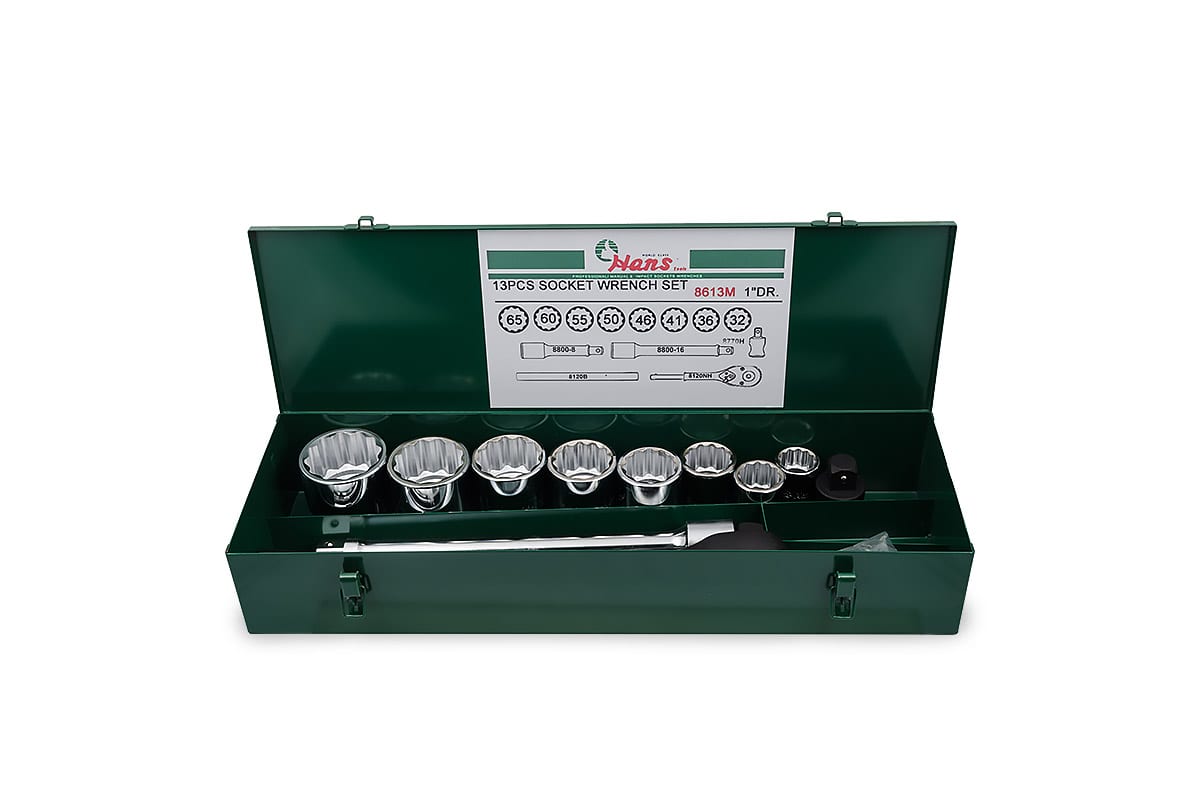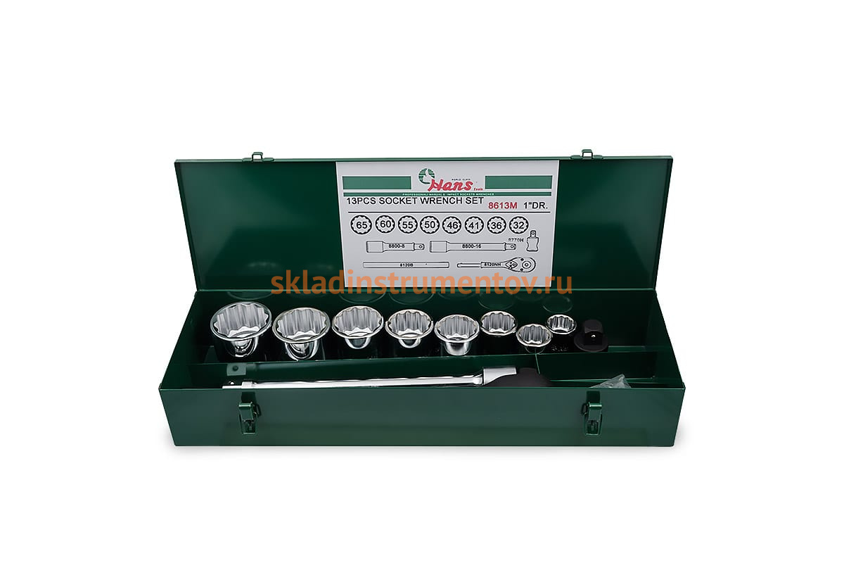 Набор инструментов Hans на 1" 13 предметов 8613M используется при монтаже и демонтаже резьбовых элементов, например, в автомобиле. В комплект входят торцевые головки больших размеров. Рабочие части изделий выполнены из прочной стали. Трещотка обладает посадочным квадратом 1". Набор обладает металлическим ящиком, который запирается при помощи защелок.