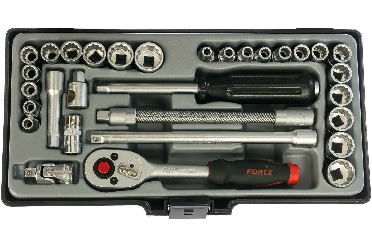 Набор инструментов с 12-ти гранными головками FORCE 2312, состоящий из 31 предмета, предназначен для работ по ремонту и обслуживанию автотранспортных средств. Присоединительный размер — 1/4. В комплект входят 12-гранные торцевые головки двух видов: метрические и дюймовые разных размеров, а также держатель биты, удлинитель, трещотка, адаптер, кардан и вороток. Инструменты удобно расположены в надежном футляре.