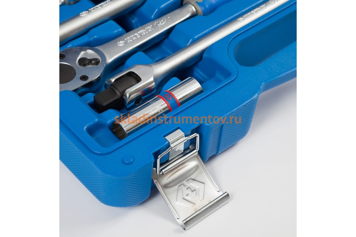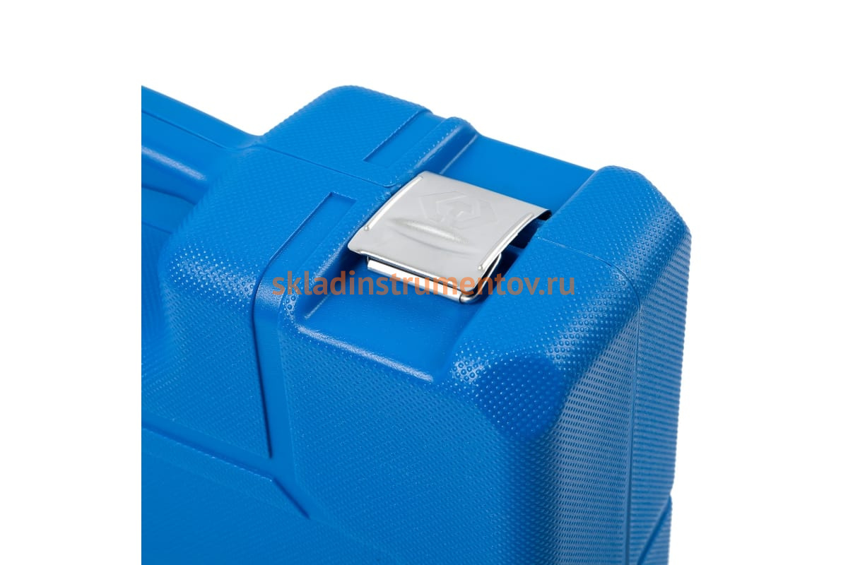 Прочный кейс изготовлен из жесткого противоударного пластика. Такая конструкция позволяет бережно хранить инструмент. Металлические замки обеспечивают надежную фиксацию и предотвращают самопроизвольное открытие чемодана.