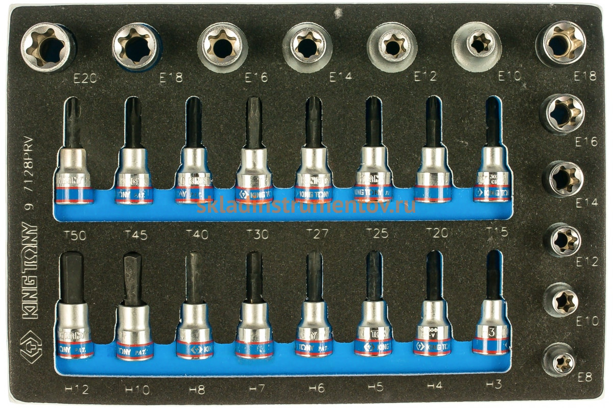 Набор торцевых насадок и головок 1/2"&3/8", TORX, HEX, Е6-Е20, ложемент, 28 предметов KING TONY 9-7128PRV представлен в оптимальной комплектации с широким размерным рядом. Предназначен для работ с резьбовыми соединениями.