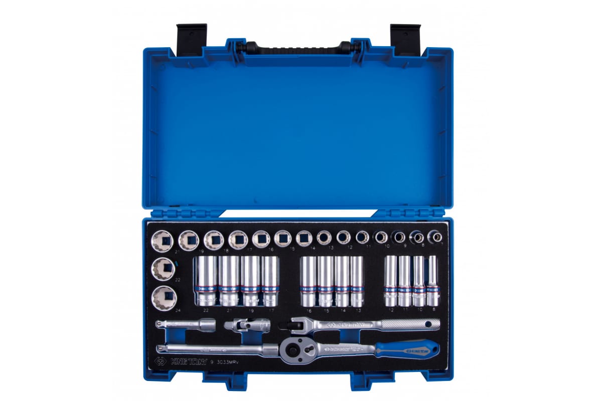 Набор торцевых головок с принадлежностями 3/8" KING TONY двенадцатигранные, 7-24 мм, 33 предмета 3033MRV подходит для профессионального использования в автомастерских, сервисных центрах, на станциях технического обслуживания, а также для бытовых целей. Отличаются прочностью и надежным исполнением.