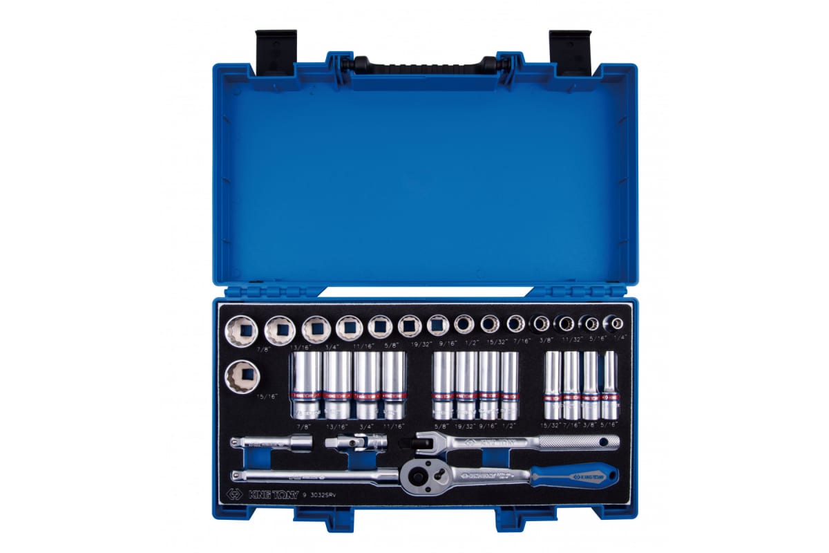 Набор торцевых головок с принадлежностями 3/8" KING TONY двенадцатигранные, 1/4"-15/16" мм, 32 3032SRV применяется для профессионального использования в автомастерских, сервисных центрах, на станциях технического обслуживания. Также подходит для бытовых целей.