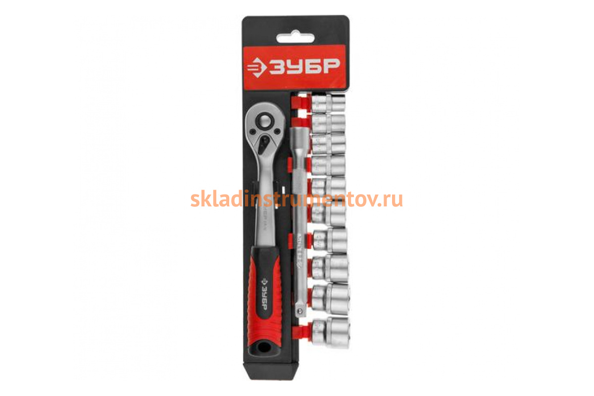 Набор "МАСТЕР": торцовые головки 3/8" на пластиковом рельсе, трещотка, удлинитель, Cr-V, 10-19мм, 12 предметов 27646-H12 подойдет для работы с шестигранным крепежом различной сложности.