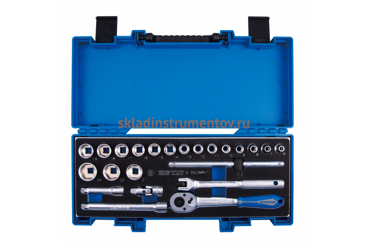 Набор торцевых головок с принадлежностями 3/8" KING TONY шестигранные, 6-24 мм, 23 предмета 3523MRV11 подходит для профессионального использования в автомастерских, сервисных центрах, на станциях технического обслуживания, а также для бытовых целей. Инструменты применяются для передачи крутящего момента крепеж.