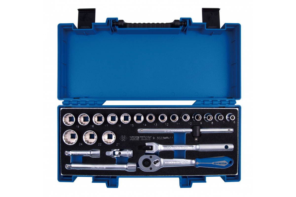 Набор торцевых головок с принадлежностями 3/8" KING TONY двенадцатигранные, 6-24 мм, 23 предмета 3023MRV11 используется для передачи крутящего момента крепеж и при монтаже и демонтаже посаженных гаек и болтов.