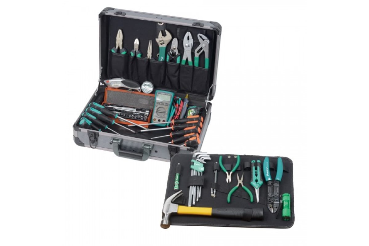 Набор инструментов ProsKit PK-4043 00325930 включает в себя широкий ассортимент губцевого инструмента, инструмента для выполнения крепежных работ, а также режущего, обжимного, электромонтажного и прочего инструмента.