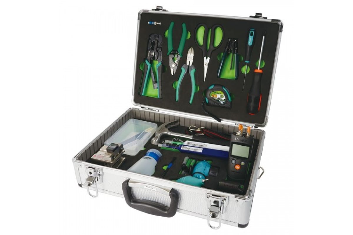 Набор инструментов ProsKit PK-9458 00325927 служит для проведения работ по монтажу оптоволоконных сетей FTTH.