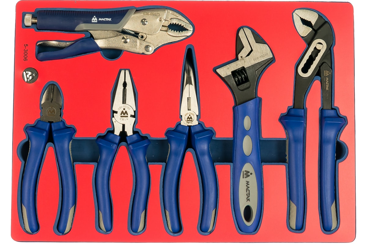 Набор пассатижей, плоскогубцев и бокорезов 6шт МАСТАК 5-3006 сочетает в себе наиболее оптимальное сочетание ручных шарнирно-губцевых инструментов для выполнения слесарно-монтажных работ. Каждый инструмент располагается в отдельной ячейке в ложементе из материала EVA. Набор идеально подходит для укомплектовывания рабочих мест в мастерских, на производстве и на станциях ТО для ремонта различной техники.