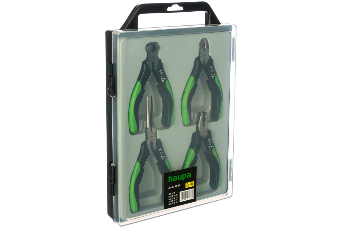 Набор клещей для электроники 4 шт HAUPA 211880 применяется для работы с проволокой и проводами, их откусывания, пережимания и удержания. Комплект поставляется в удобном чемодане, который облегчает хранение и транспортировку инструментов. Рабочие части выполнены из специальной инструментальной стали. Двухкомпонентные рукоятки не скользят в руке.