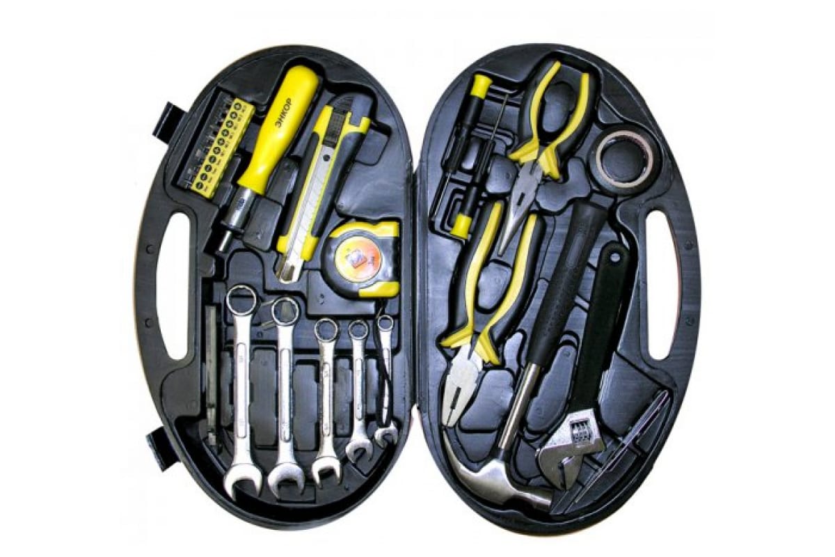 Набор инструментов, 28 предметов Энкор 57052 пригодится при ремонтных и монтажных работах как в домашних условиях, так и при профессиональном использовании. Ключи и головки инструментов выполнены из легированной стали, что придает им особую прочность. Инструменты компактно собраны в пластиковом кейсе, поставляемом в комплекте.