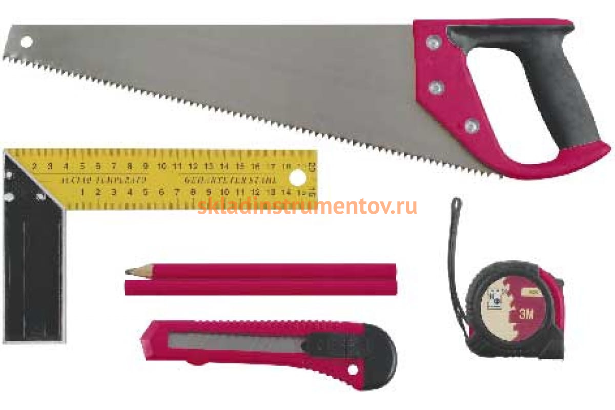 Столярный набор Контрфорс 140040 состоит из шести инструментов, которые пригодятся для выполнения ремонтных и отделочных работ. Ножовка служит для распиловки древесины, фанеры и ДСП. Удобная рулетка и два карандаша предназначены для нанесения разметки. С помощью угольника можно проверить точность прямых углов и нанести разметку на поверхность. Технический нож для разрезания различных материалов.