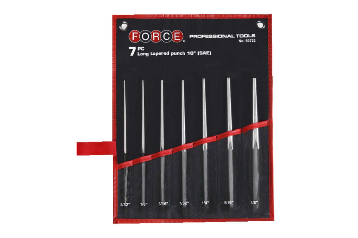 Набор длинных конических кернов FORCE 7 шт. 50722 пригодится для пробивания отверстий в твердых заготовках или вырезания пазов. Инструменты выполнены из прочной и качественной стали.