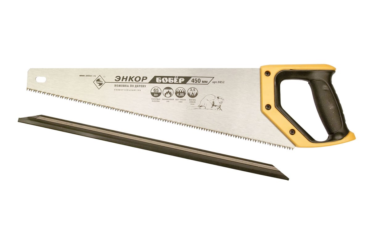 Ножовка с закаленным зубом Энкор Бобер 9852 предназначена для пиления заготовок из древесины. Полотно выполнено из стали 65 Mn с заточенными под двумя углами зубьями. Пластиковая рукоятка частично обрезинена для надежного хвата и удобства при работе. Зубья высотой 3.5 мм разведены, что обеспечивает гладкость реза.