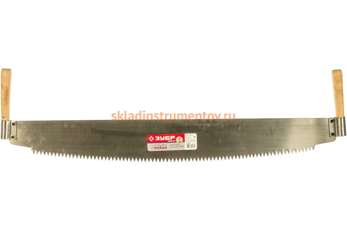 Двуручная пила ЗУБР 1524-100 - инструмент для быстрого распиливания больших деревянных заготовок в обоих направлениях двумя людьми. Режущее полотно длиной 1000 мм изготовлено из высокопрочной стали. Прямые зубья с шагом 12 мм позволяют эффективно распиливать древесину.