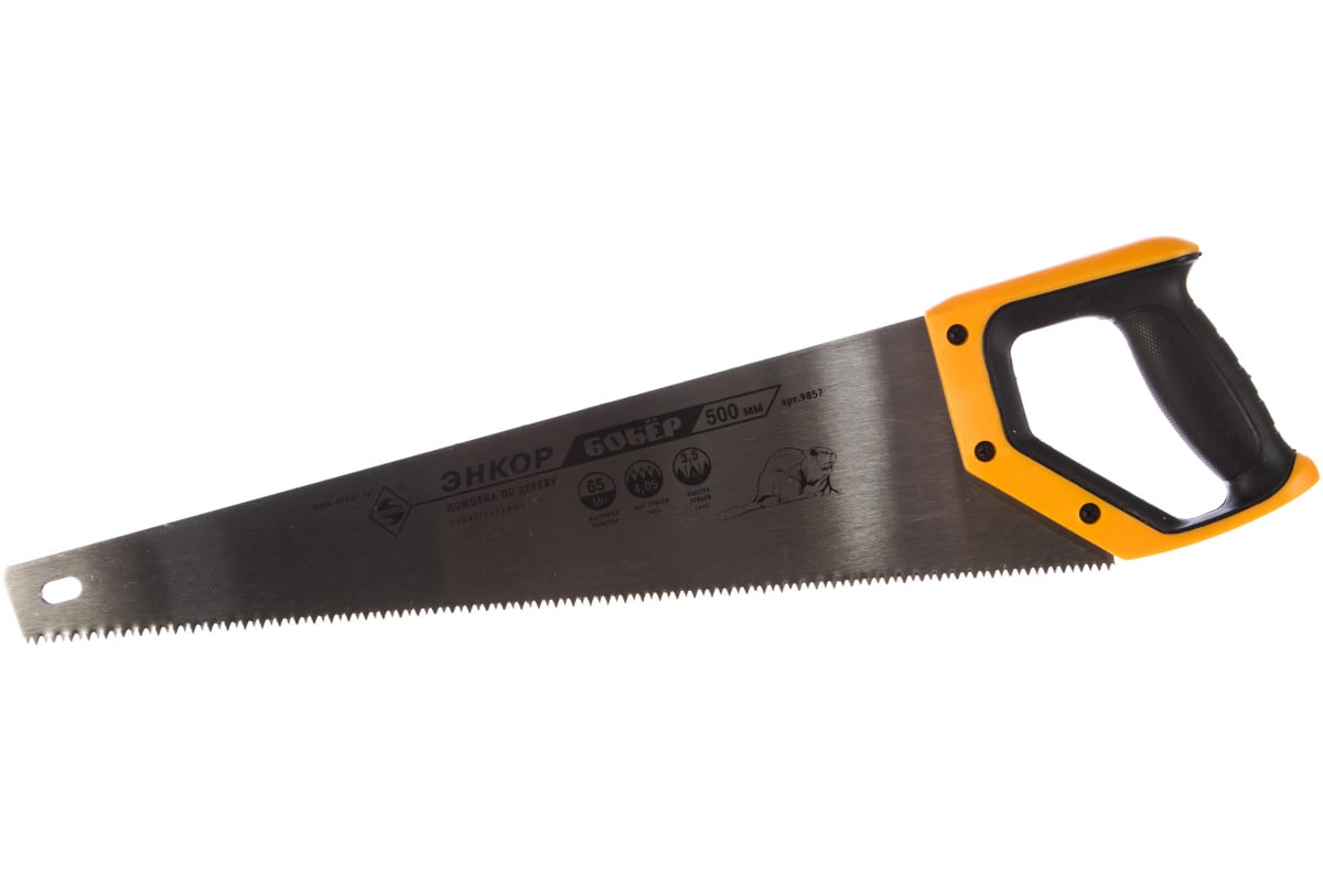 Ножовка Энкор Бобер 9857 - надежный инструмент для распила древесины. Лезвие инструмента изготовлено из легированной стали, что гарантирует использование инструмента долгие годы. Рукоятка обрезинена, комфортно располагается в руке.
