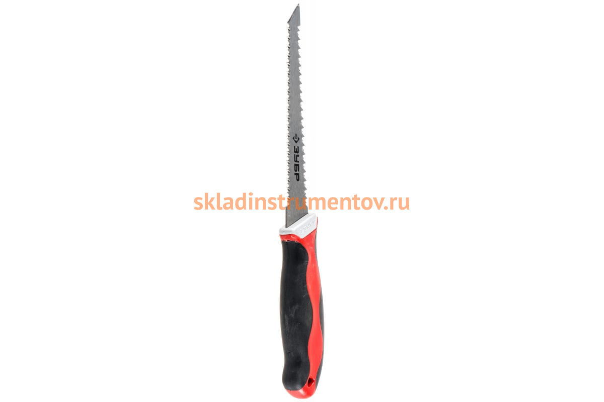Выкружная мини-ножовка Зубр для гипсокартона 15178_z01 предназначена для резки гипсокартона, линолеума, пластика, древесины и прочих материалов. Стальное режущее полотно оснащено зубьями с двух сторон, что позволяет пилить в любом направлении. Двугранная заточка гарантирует легкий и быстрый рез, а также повышает срок службы инструмента. Наличие заостренного кончика позволяет протыкать материал перед началом работы. Трехкомпонентная рукоятка обеспечивает крепкий хват и надежно фиксирует полотно благодаря усиленной металлической вставке.