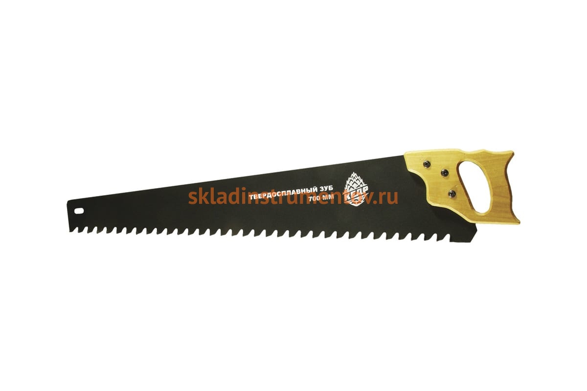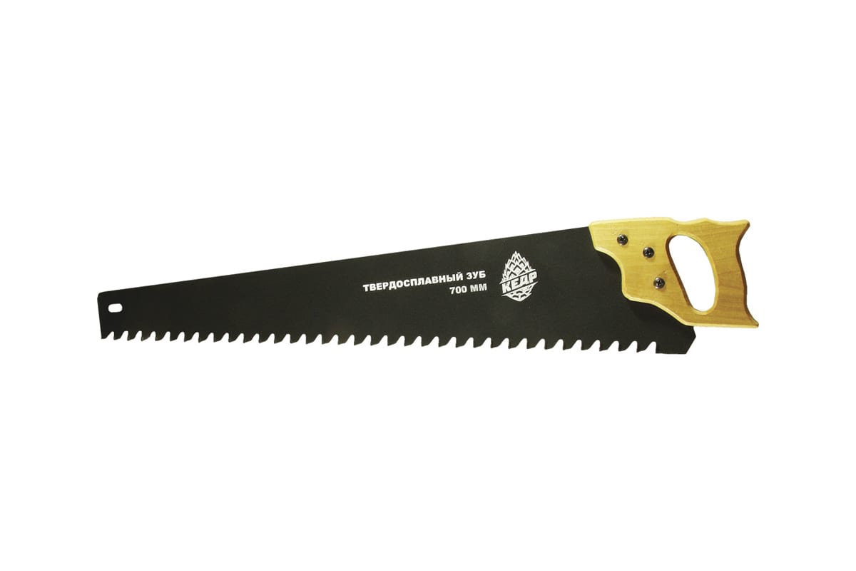 Ножовка по газосиликату с деревянной ручкой 700 мм КЕДР 086-0700 51312 оснащена крупными зубьями без закаливания. Это обеспечивает твердость инструмента без хрупкости режущих кромок. Деревянная рукоятка защищает пальцы с обеих сторон.