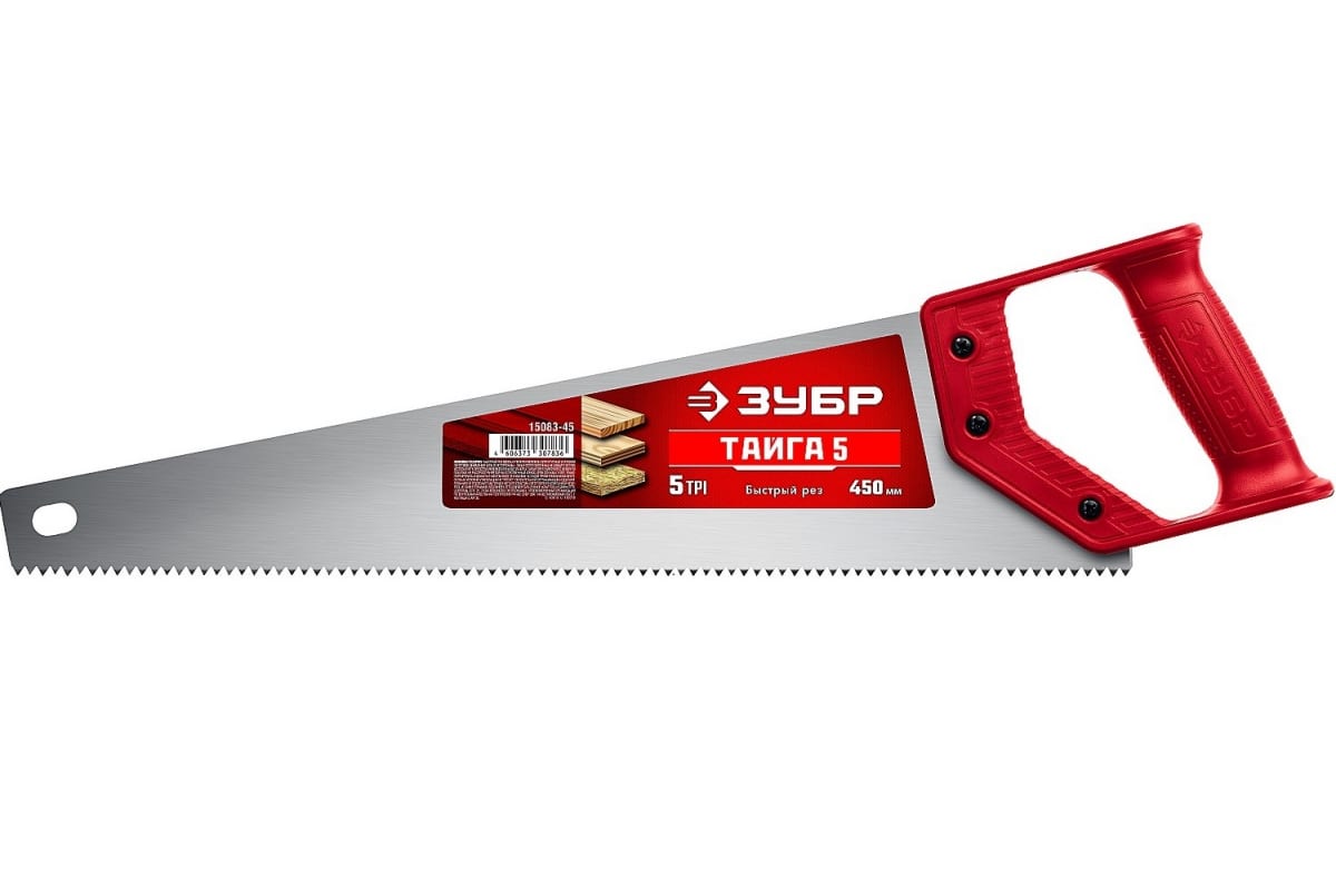 Ножовка для быстрого реза Зубр ТАЙГА-5 450 мм, 5 TPI, рез поперек волокон 15083-45 оптимально подходит для продольного и поперечного распила. Импульсная закалка каждого зуба обеспечивает быстрый и ровный рез.