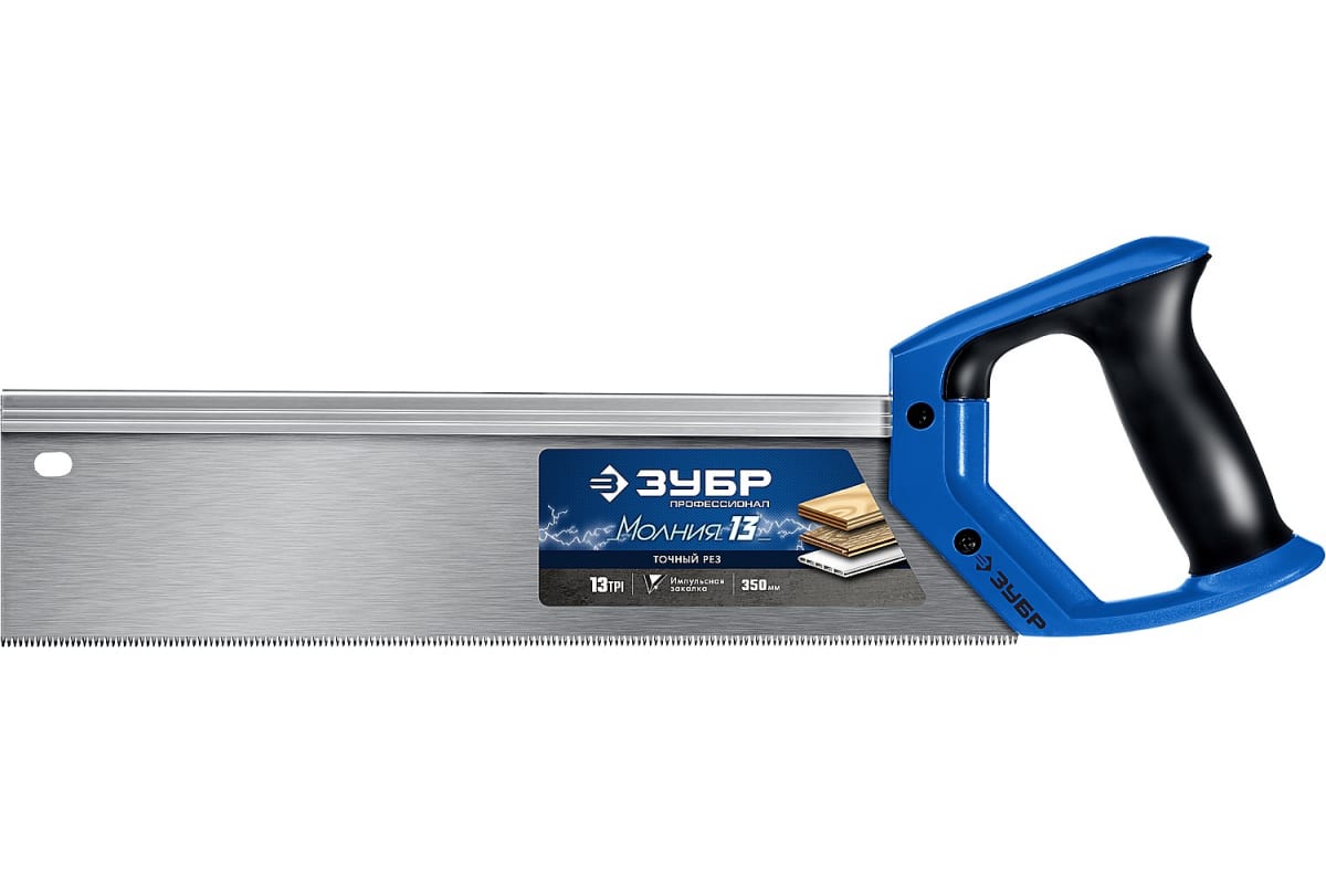 Ножовка с обушком для стусла пила Зубр "МОЛНИЯ 13" 35 х 11 см, 13 TPI, точный рез 15155-35_z01 позволяет пилить фанеру и ламинат, а также пластик за счет мелкого шага зубьев.